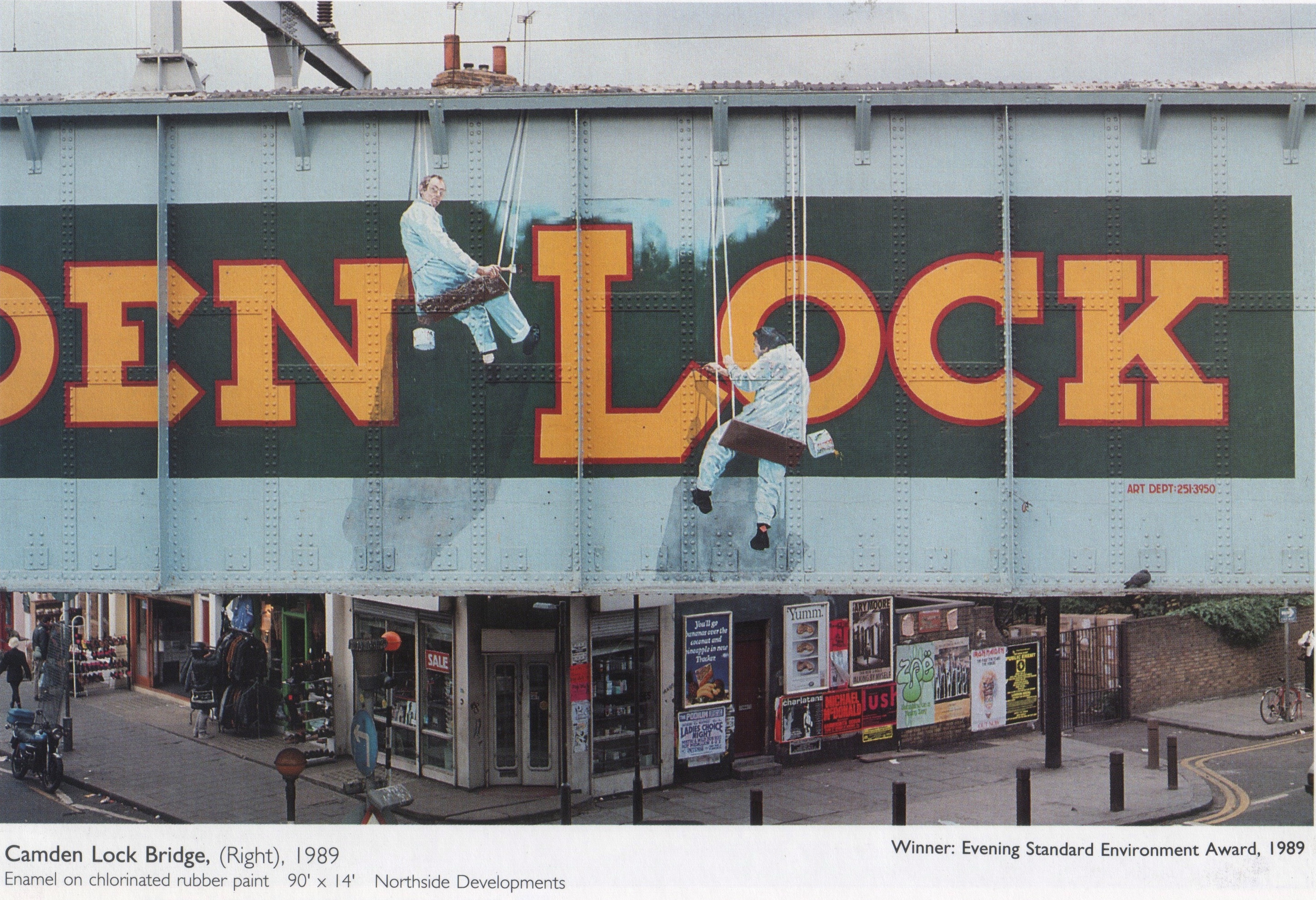 When Oddbins stopped having hand-painted shop-fronts in the late l980s, the small group of artists carried on as freelance sign-painters, achieving particular recognition for their decoration of the bridge at Camden Lock in 1989, and when Tim’s design for a hoarding won the 1990 Hillier Parker Hoarding of the Year prize.