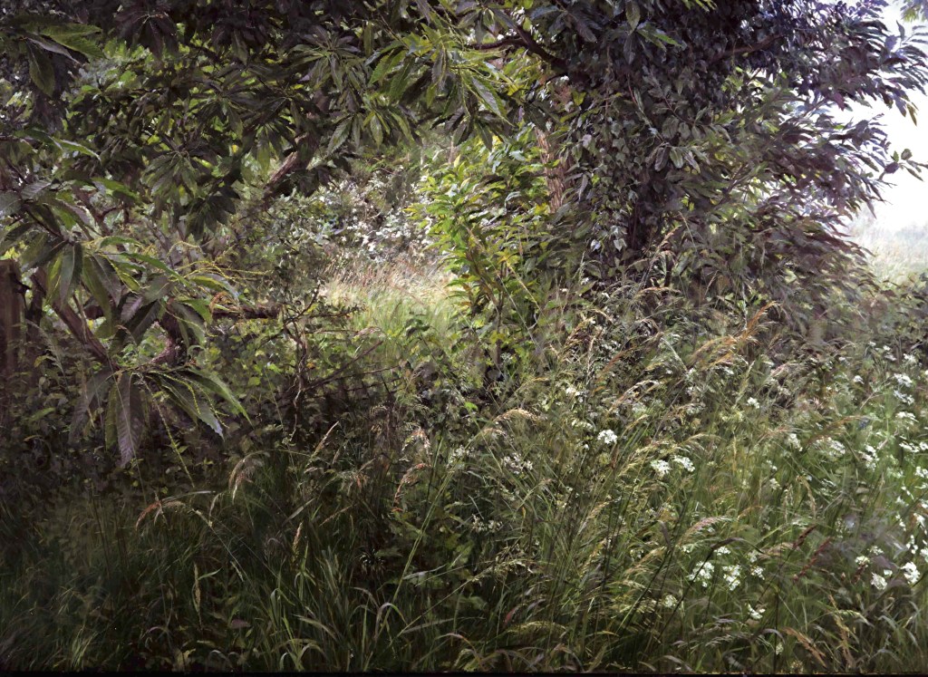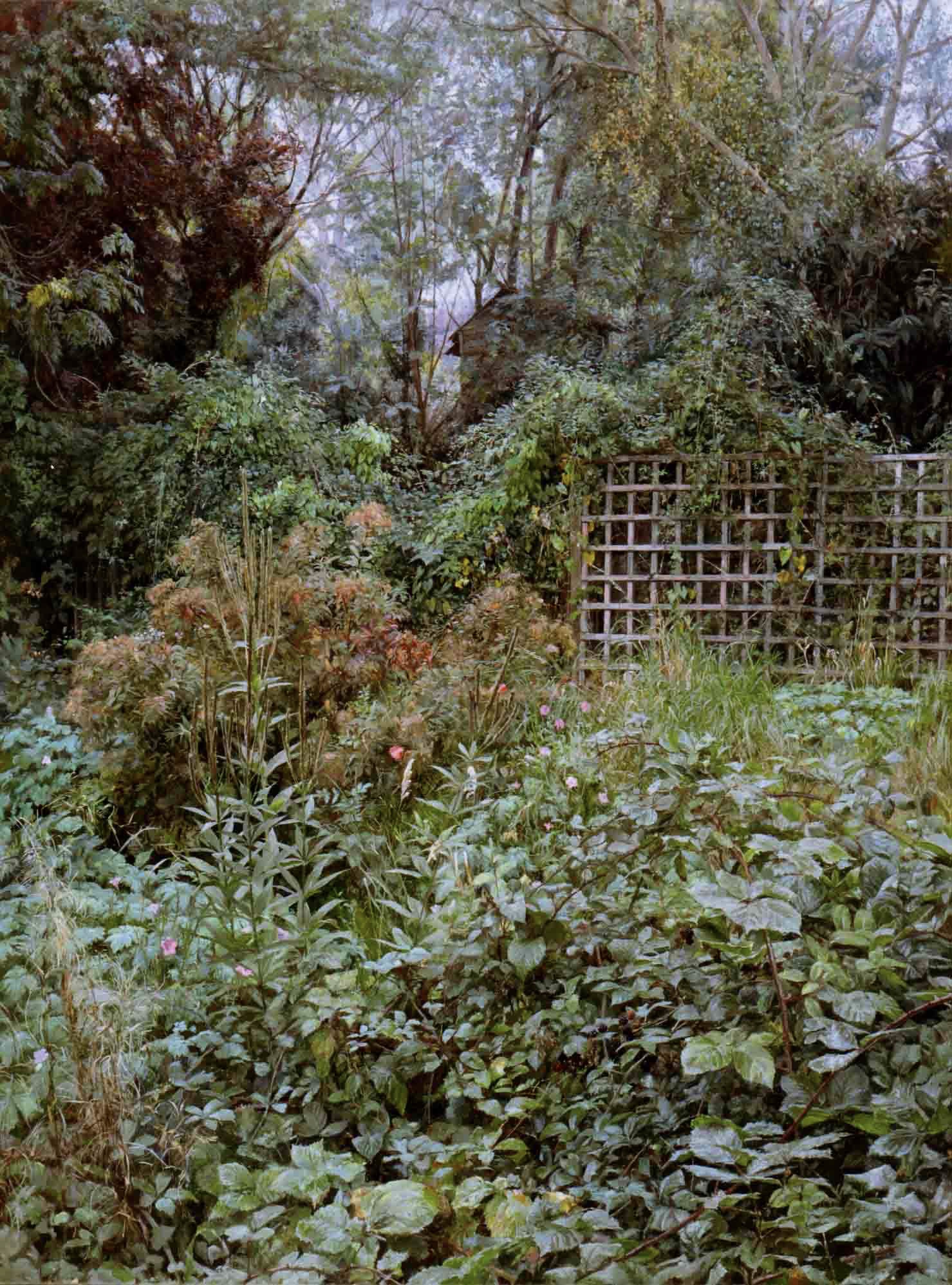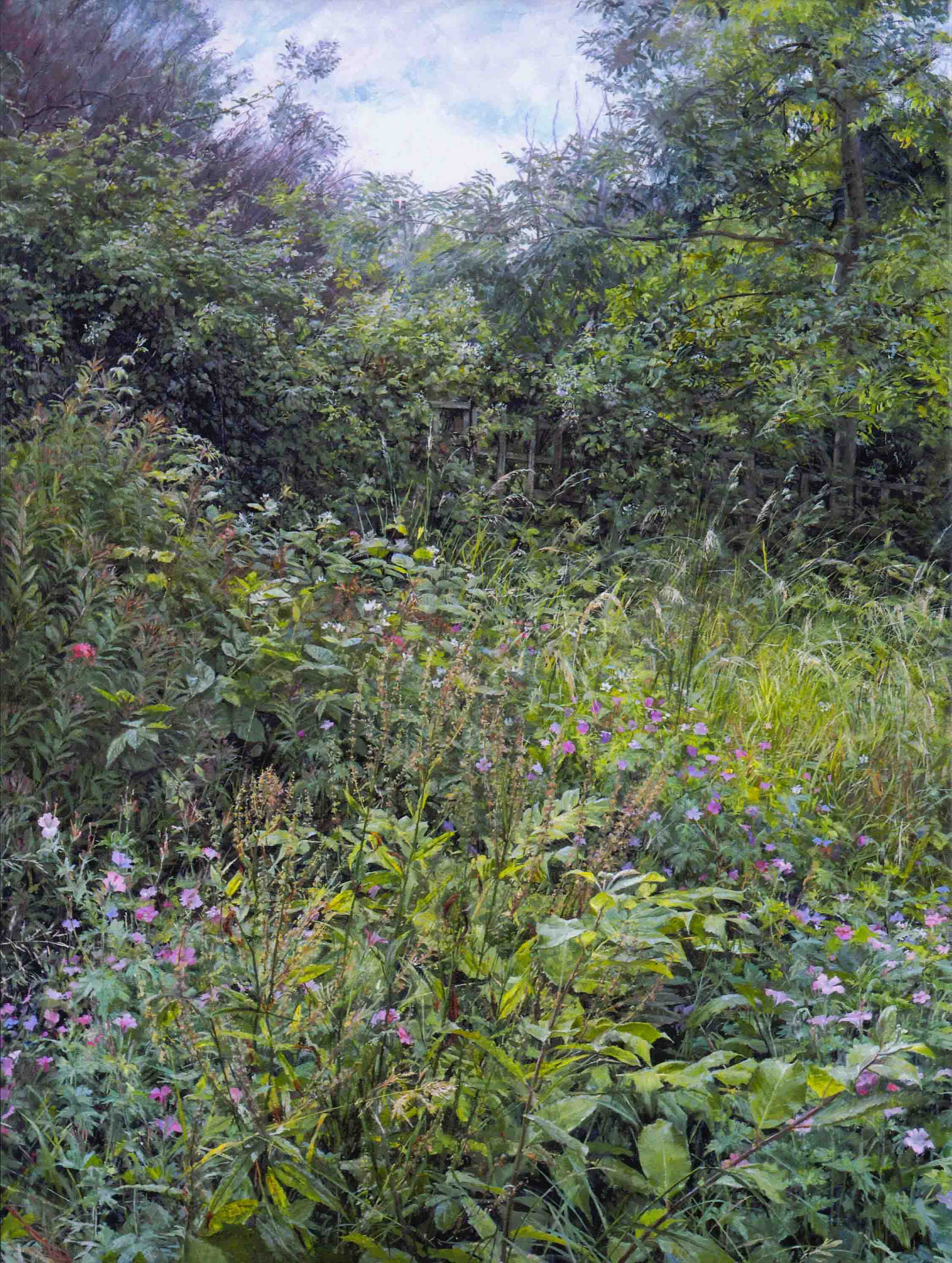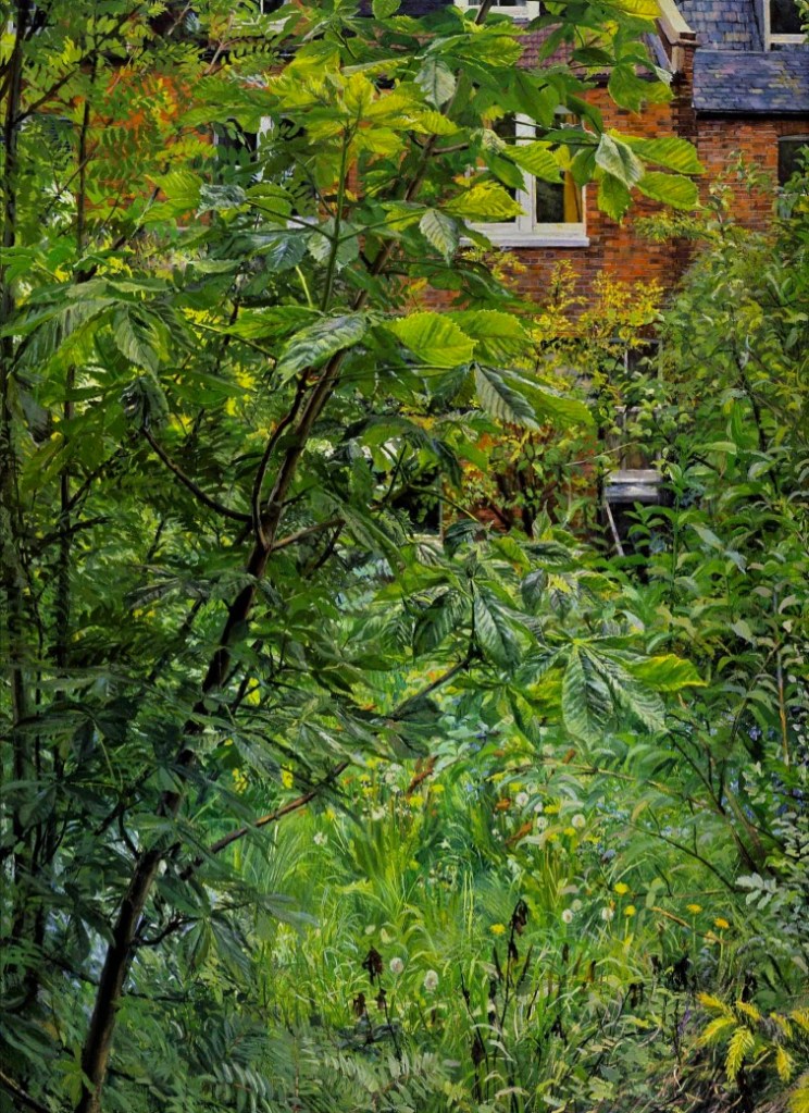 Above: PLANTSCAPES – Tree House, oil on canvas 40″x30″ 2007 – Les Bouillons, Evening, oil on canvas 4’x3′ 2002 – Midsummer Oil on canvas 32″x24″ 2005 – Clement’s Garden, Oil on panel 4’x3′ 1986.