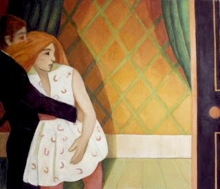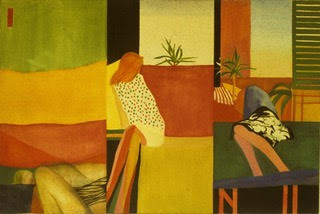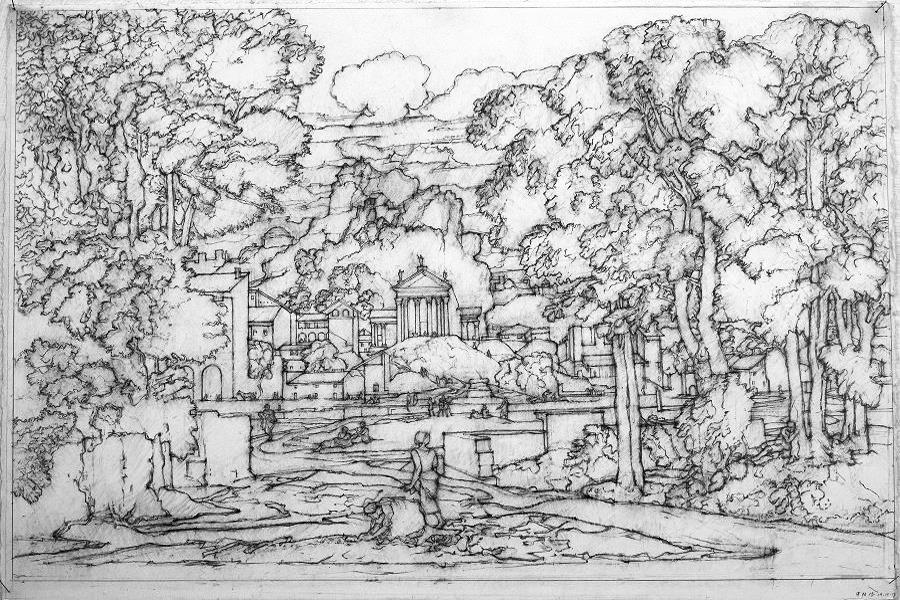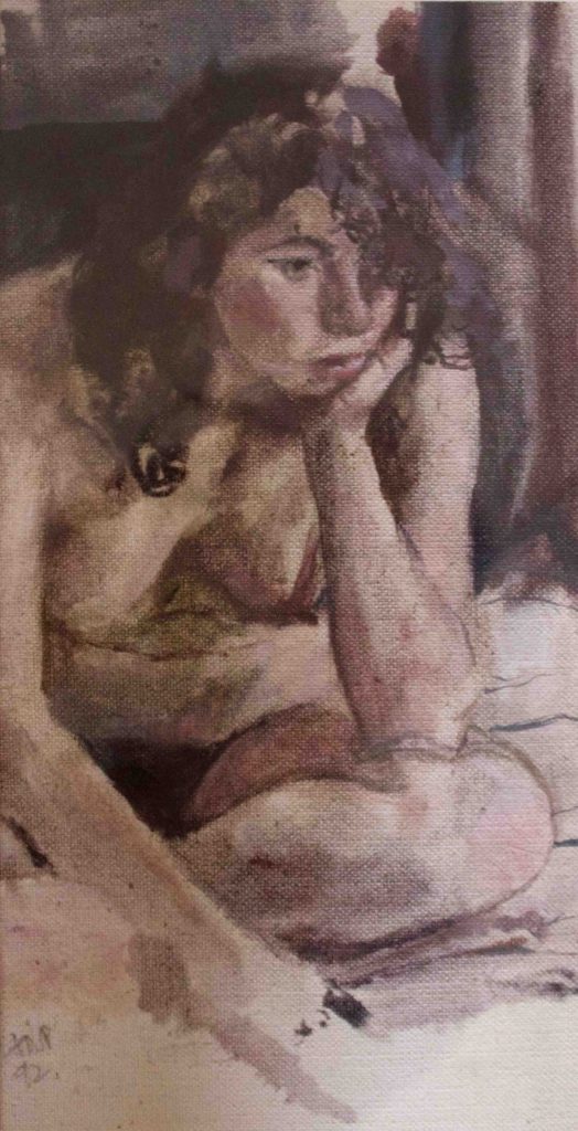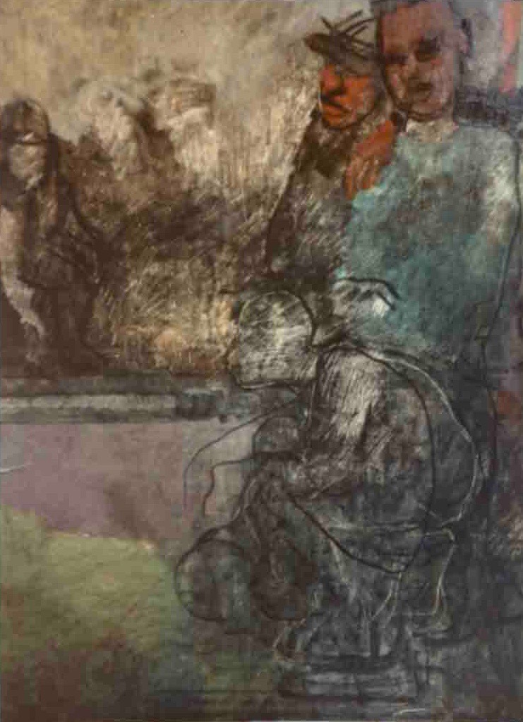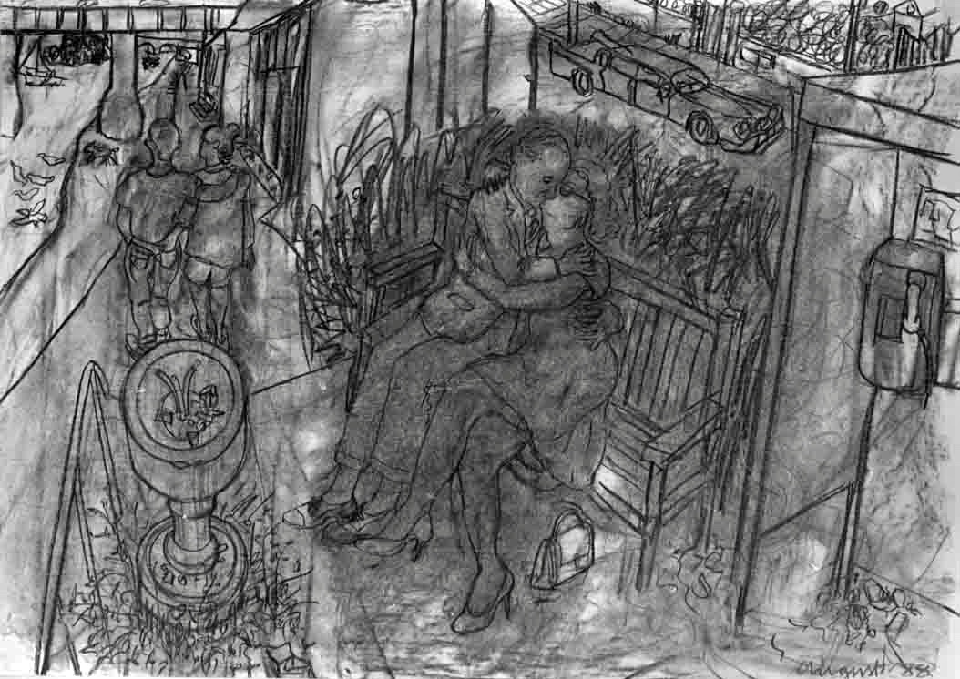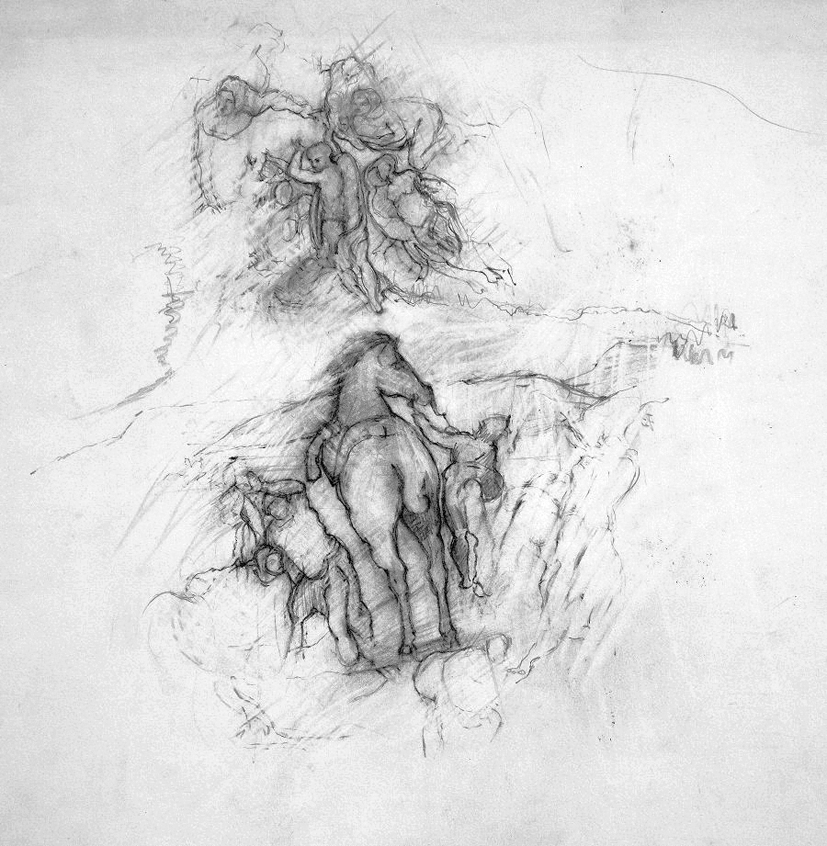 Like all Keon’s paintings, whether abstract or figurative, the Judgement of Paris painting passed through many stages, beginning with the idea of “The Three Graces”, a reference to Antonio Canova’s marble sculpture which at the time of painting was in the news. Another transient theme was youth and age, celebrated in the earlier drawing of an elderly couple kissing on a park bench beside a drinking fountain.